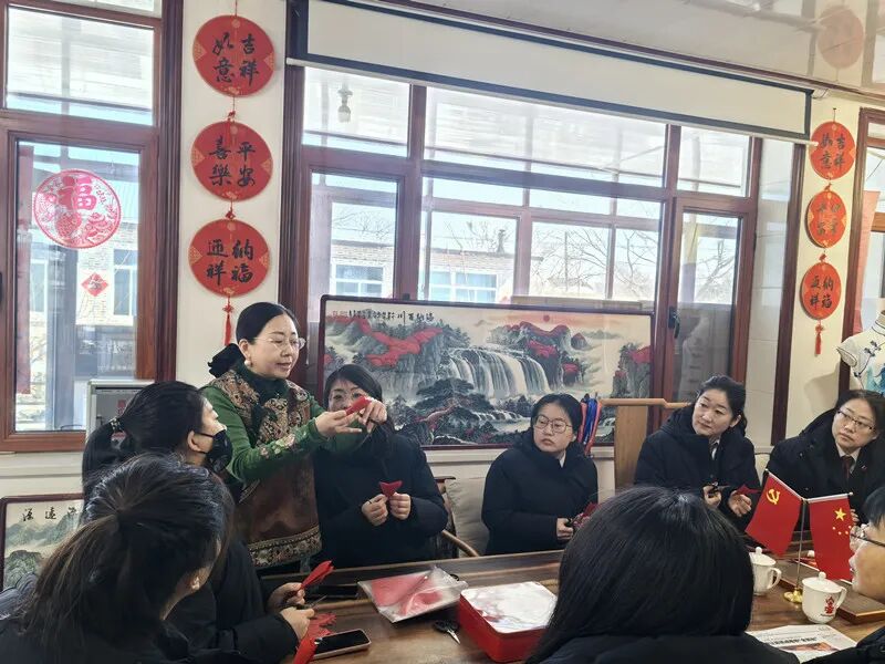 参观结束后,最令人期待的剪纸教学环节正式开始。同样是非遗传承人的赵玲玲老师结合三八节主题,选取了寓意美好、简单易上手的剪纸样式,重点教授了剪纸基础技法——五折法和锯齿剪,从五折法的纸张折叠技巧、角度把控,到锯齿剪的握持姿势、发力节奏,再到图案的勾勒、镂空的诀窍,耐心细致地为大家讲解每一个步骤,手把手地指导大家操作。现场氛围热烈而温馨,大家热情高涨、积极参与,纷纷拿起红纸和剪刀,认真学习、大胆尝试。