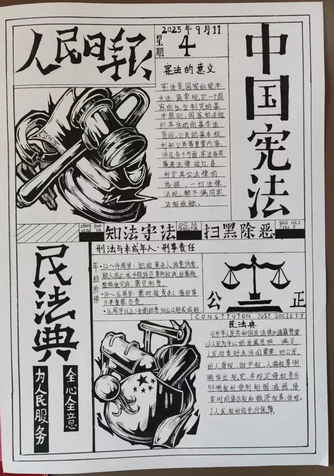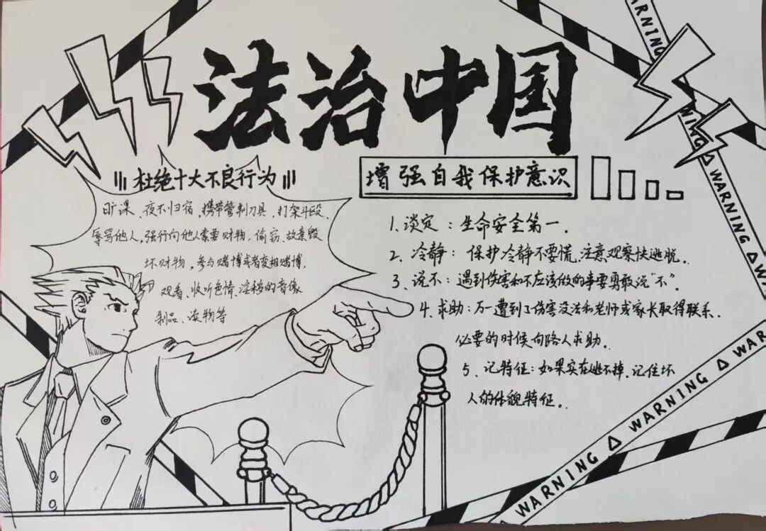 课后延伸的比赛成为“巩固法治学习的关键一环”:活动不仅聚焦日常法律知识,更专门设置反有组织犯罪宣传板块,引导同学们通过画笔、文字认识“什么是校园欺凌背后的不良团伙”“如何拒绝陌生人引诱”。从学生作品和反馈里,能清晰看到课堂知识的“落地生根”。