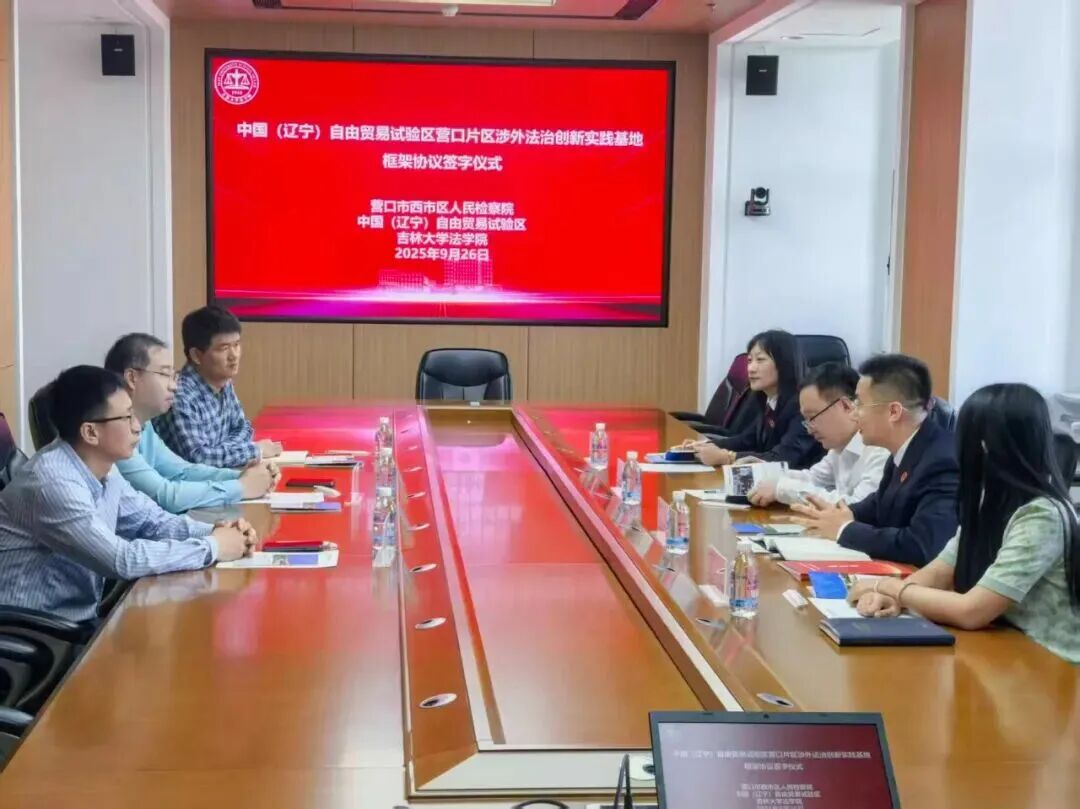 为深入贯彻习近平新时代中国特色社会主义思想,全面落实应勇检察长关于高质效推进涉外检察工作的指示批示精神,加强涉外法治理论研究与实务协同创新,切实服务高质量发展和高水平对外开放。2025年9月26日,营口市西市区人民检察院、吉林大学法学院、中国(辽宁)自由贸易试验区营口片区管委会与吉林大学联合举行《关于共建中国(辽宁)自由贸易试验区营口片区涉外法治创新实践基地的合作备忘录》(以下简称《合作备忘录》)会签仪式。西市区人民检察院副检察长杨俊,吉林大学法学院副院长吕欣、谢登科,自贸区营商环境与法规局局长雒晓星出席本次仪式。