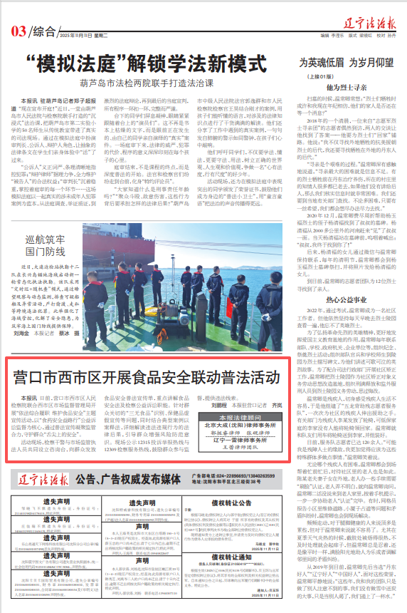 日前,营口市西市区人民检察院联合西市区市场监督管理局开展“依法综合履职 维护食品安全”主题宣传活动,以“食药安全益路行”公益诉讼监督为核心,通过普法宣传凝聚监管合力,守护群众“舌尖上的安全”。