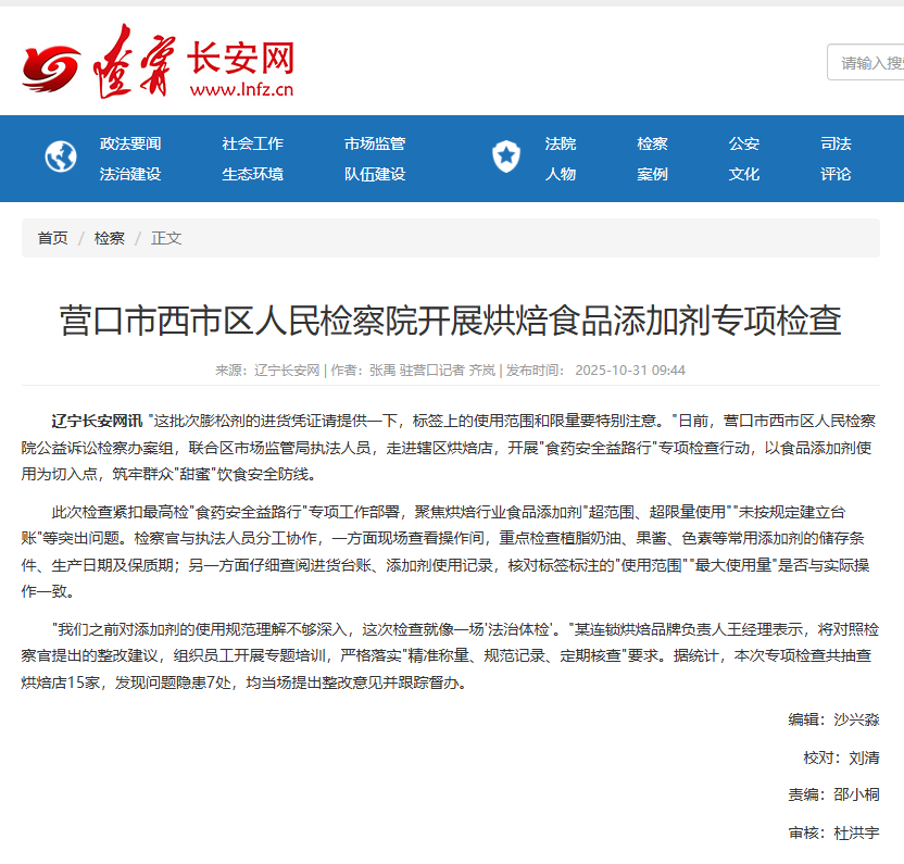 “这批次膨松剂的进货凭证请提供一下,标签上的使用范围和限量要特别注意。”日前,营口市西市区人民检察院公益诉讼检察办案组,联合区市场监管局执法人员,走进辖区烘焙店,开展“食药安全益路行”专项检查行动,以食品添加剂使用为切入点,筑牢群众“甜蜜”饮食安全防线。